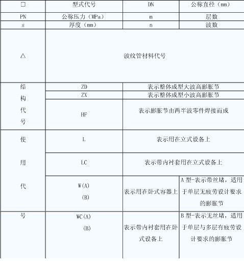 表示:公称通径为Φ500,工作压力为0.6MPa,(6kg/cm2)波数为4个,带导流筒,碳钢法兰连接的内压式波纹膨胀节。